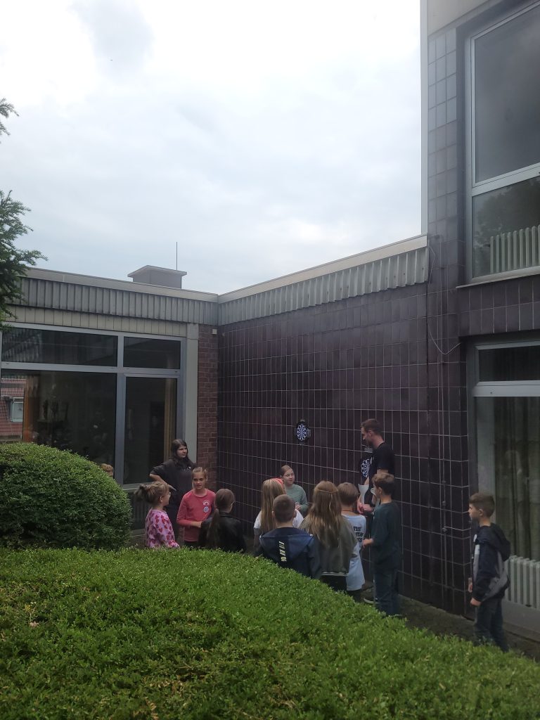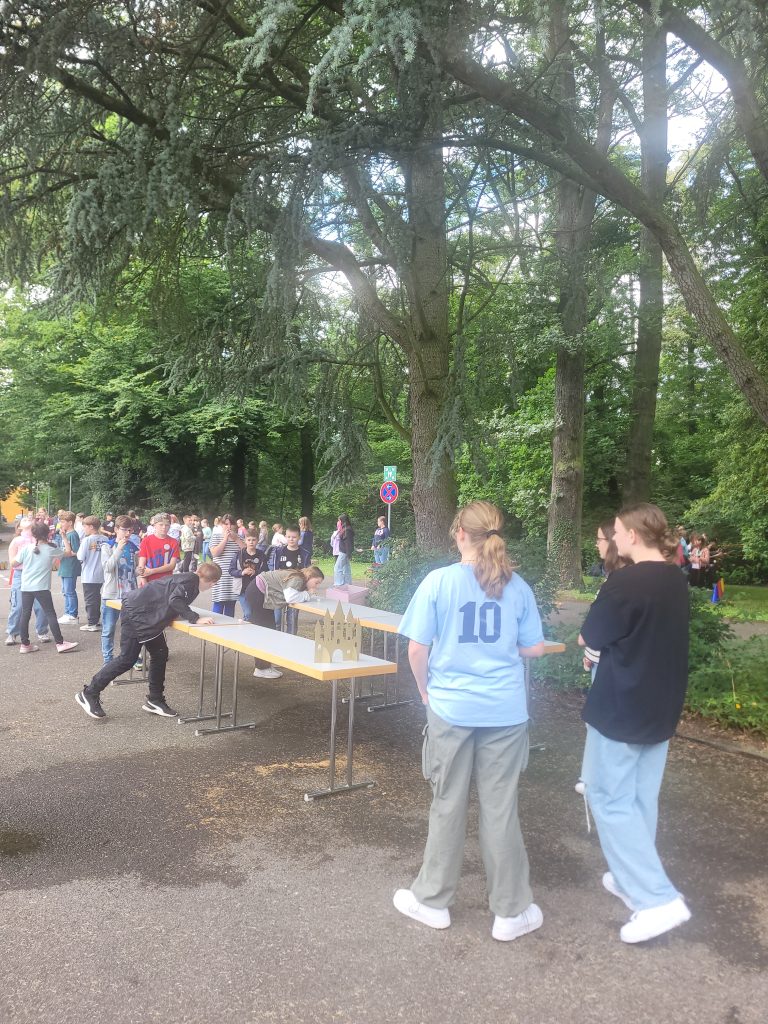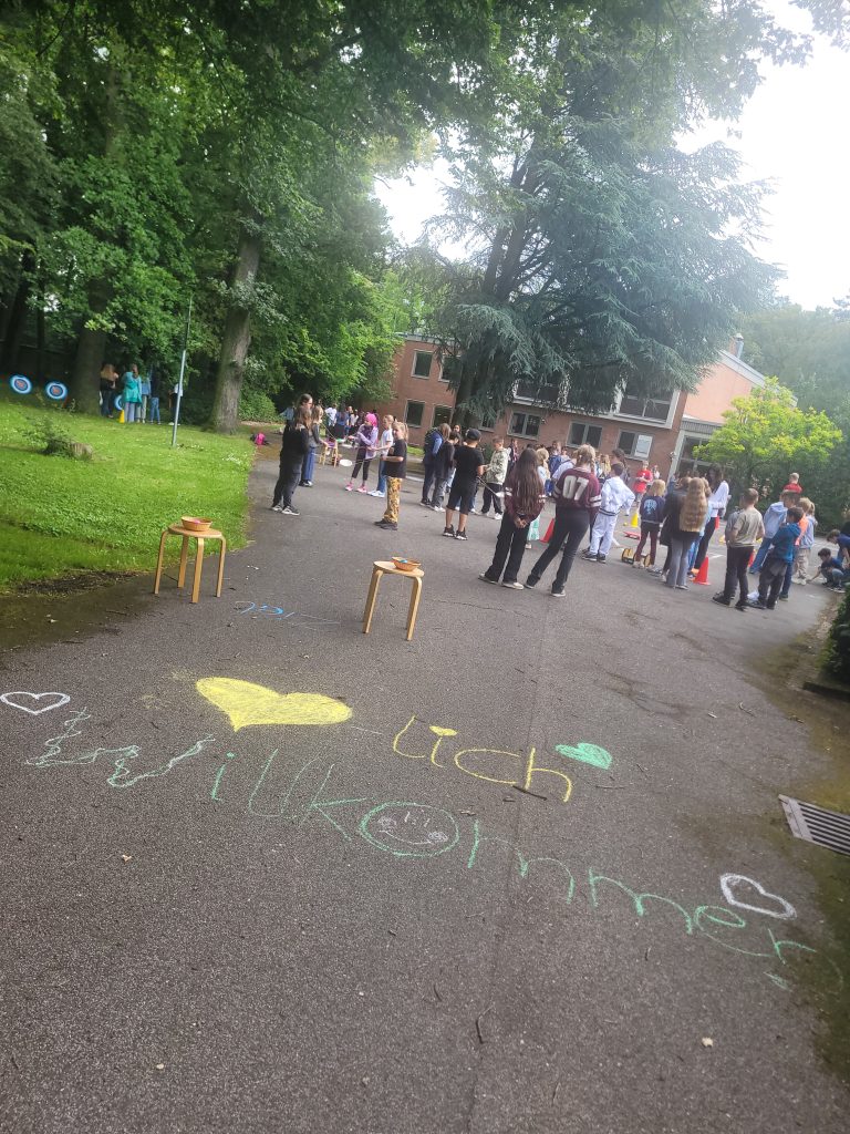 Am 19. Juni 2024 fand der Kennenlernnachmittag für die kommenden 5. Klassen statt. Um 14.30 Uhr begann das Ereignis: Das Kollegium empfing die Kinder herzlich, während Schüler*innen der Tagesstätte Namensbuttons verteilten. Frau Krüger, die Konrektorin, hieß alle willkommen, und Frau Klemens, die Leiterin der Tagesstätte, erklärte kurz den Ablauf des Nachmittags.