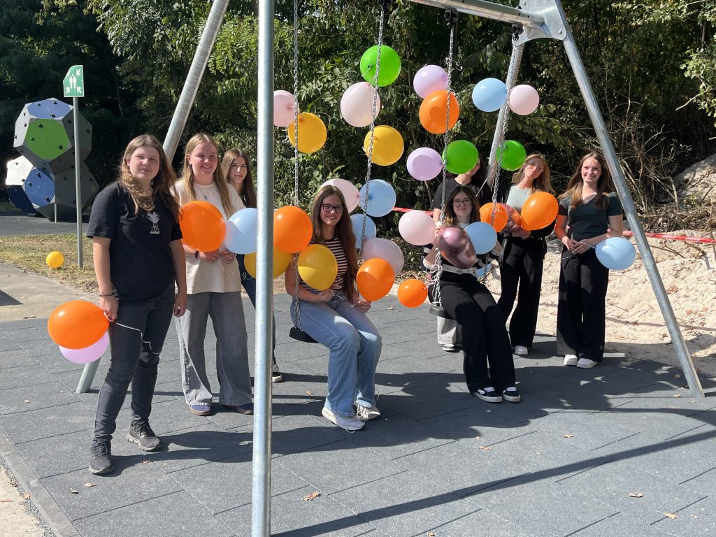 Dank der finanziellen Unterstützung des Trägers, des Fördervereins und der SV hat unsere Schule eine neue Schauke bekommen, die zur Einweihung zu Beginn des neuen Schuljahres von Schülerinnen der 10. Klassen mit Luftballons dekoriert worden ist.